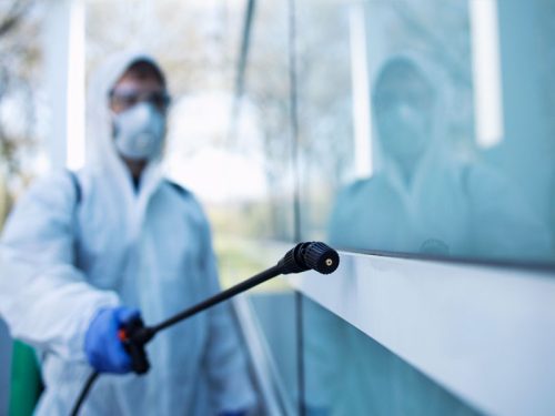 En áreas exteriores y grandes superficies utilizamos pulverizadores de mayor capacidad y equipos motorizados, adaptados al entorno y tipo de superficie.